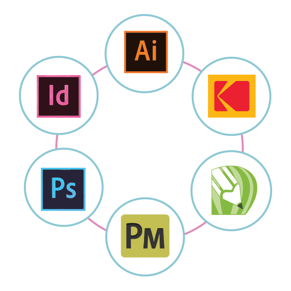 We use Computer-to-Plate (CTP) thermal imaging technology, which produces first generation dots with efficient and fine images. We work on software’s like Adobe In-Design, Illustrator, Photoshop, PageMaker, Corel-Draw. For Imposition we use Kodak-preps.
